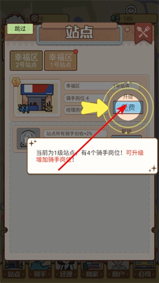 升级站点规模,可在站点界面进行升级操作,以此增加骑手岗位数量、扩大业务规模并提升处理能力。
