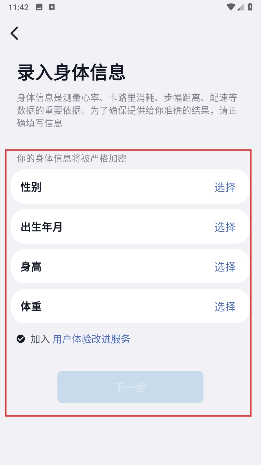 在身体信息录入页面,按顺序选择性别、出生年月、身高和体重,勾选“加入用户体验改进服务”选项后,点击【下一步】按钮。