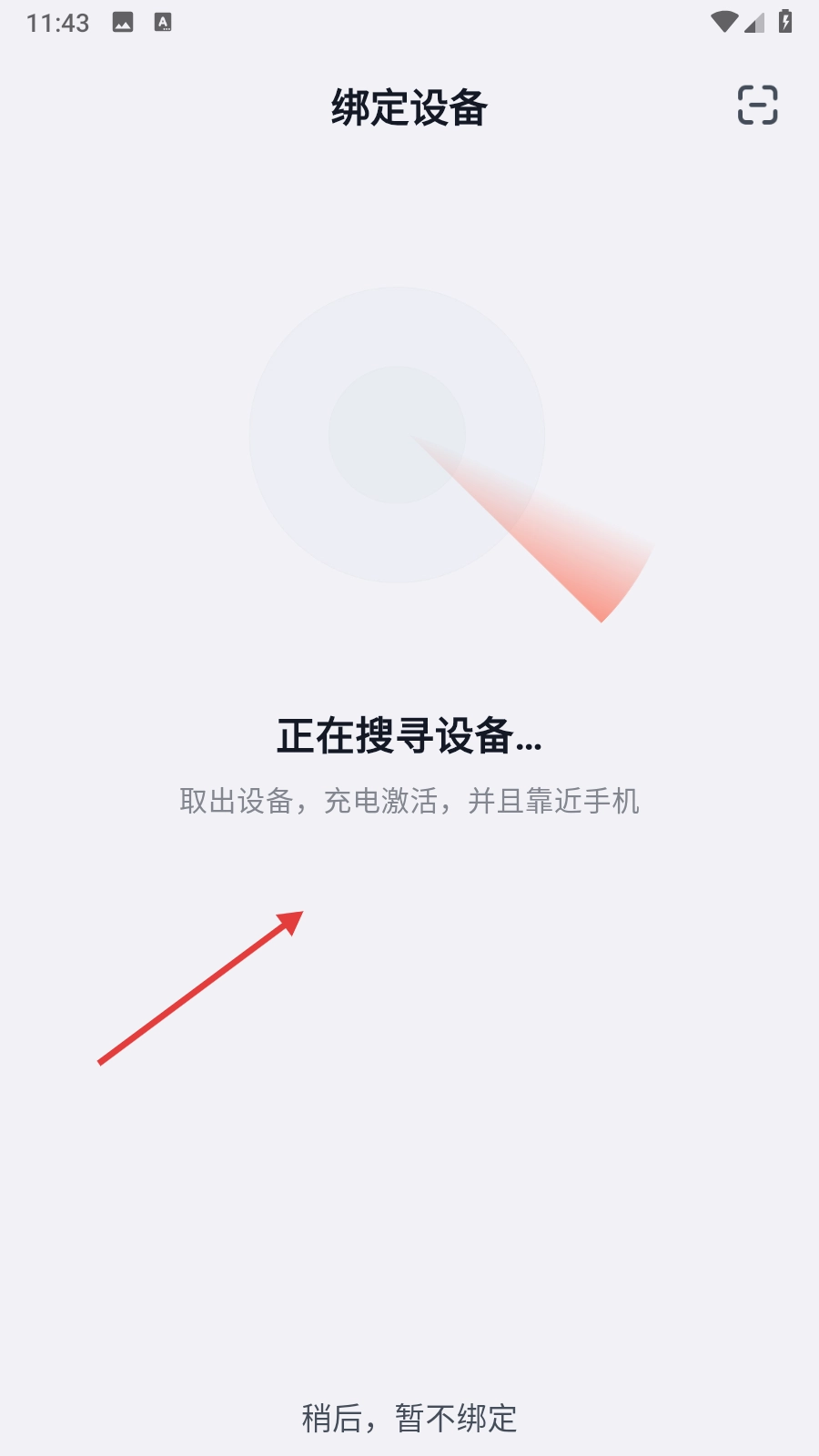 在绑定设备的页面上,你可以选择取出设备进行充电激活,然后将其靠近手机来完成绑定操作;也可以点击【稍后,暂不绑定】按钮,直接跳过这一步骤。
