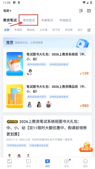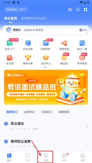 打开教资备考类板块,点击底部的课程选项,即可进入课程页面。