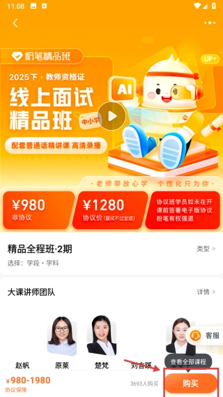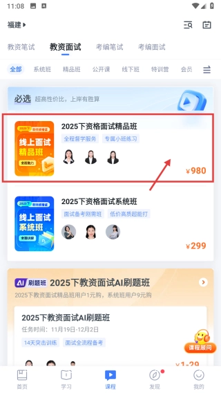 在教资面试课程列表页面,挑选2026下半年资格面试精品班课程,进入该课程的详情页面。