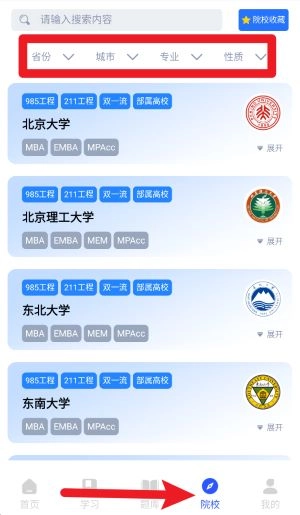 在院校板块中,你可以按照省份、城市、专业、院校性质等不同条件,筛选出符合需求的目标学校及其研究方向。