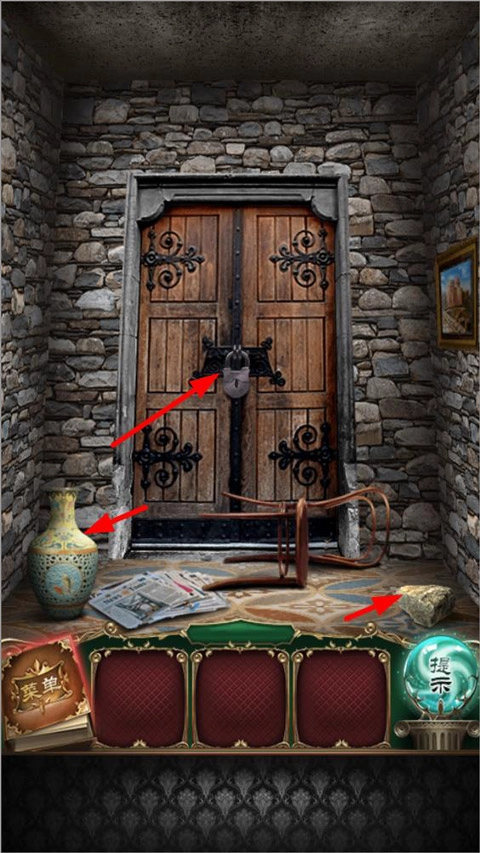 到了第二关就没有提示了,我们得先捡起右边的石头,用它打碎左边的花瓶,这样就能拿到里面的钥匙,接着用钥匙打开大门,就能进入第三关了。