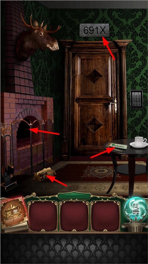 来到第四关,首先要从左侧火炉旁取来木柴,接着去右边的桌子上找到火柴。之后将木柴放进左边的火炉里,再用火柴把它点燃。此时能看到火炉壁上显示着数字4,而这一关的密码是6914,输入密码打开门就能进入第五关了。