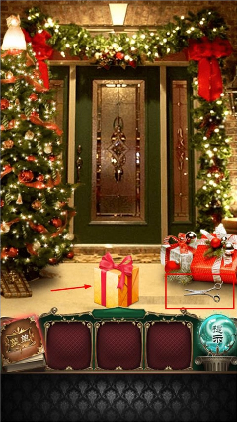 第七关时,我们将右侧的礼物挪到中间位置,随即发现地面上有一把剪刀。接着,我们用这把剪刀拆开中间的礼物,从中取出一把钥匙,并用它打开大门。大门开启后,我们便进入了第八关。