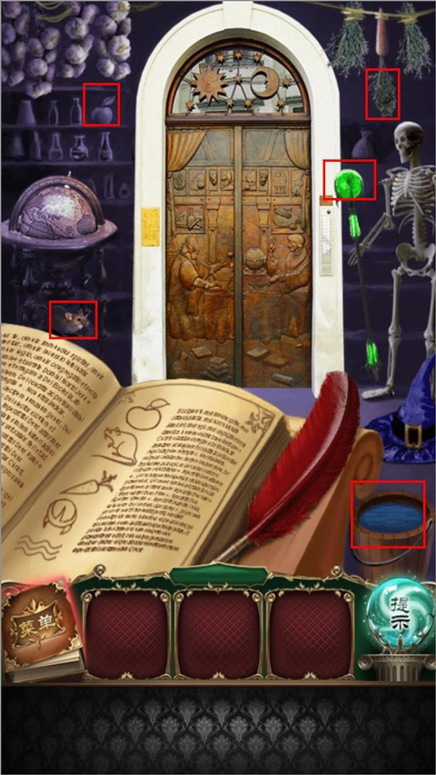 第六关是寻物关卡,先在左侧架子上找到一颗苹果,再从下方获取一只老鼠,接着到右边拿取胡萝卜和骷髅身上的宝石,最后点击水,门就会开启,随后进入第七关。