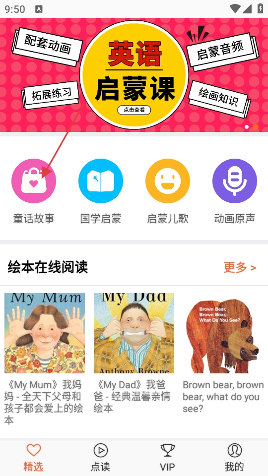 在软件精选页面,点击【童话故事】选项,即可进入童话故事列表页面。