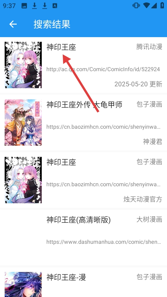 在搜索结果里,点击你要找的漫画条目,比如【神印王座】,就能进入该漫画的详情页面。