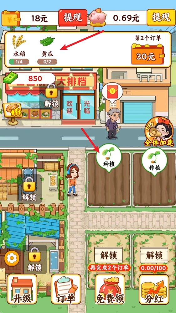 进入游戏后,我们可以在界面上方查看自己的订单内容,接着点击空地就能开始种植了。