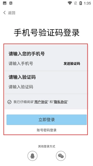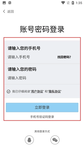 若选择账号密码登录方式,需在对应的登录页面填写手机号与密码,勾选同意相关协议后,点击【立即登录】按钮,就能完成登录流程。