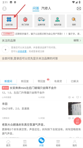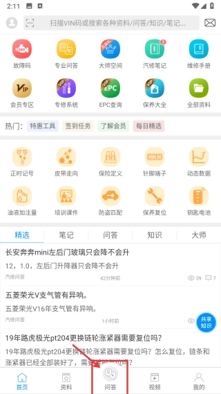 打开汽车维修分类,点击页面底部的问答选项,进入问答界面。