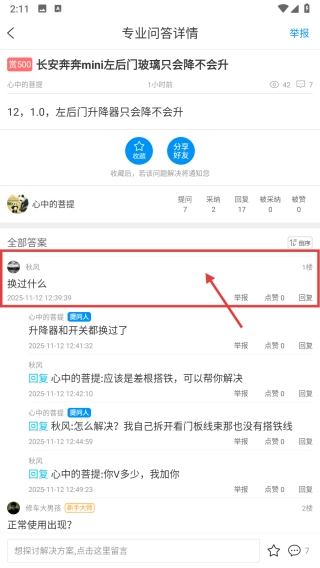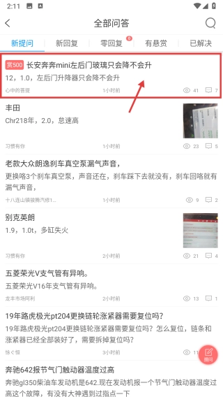 在所有问答列表页面,找到关于长安奔奔mini左后门玻璃仅能下降无法上升的问答,点击进入该专业问答的详情页面。