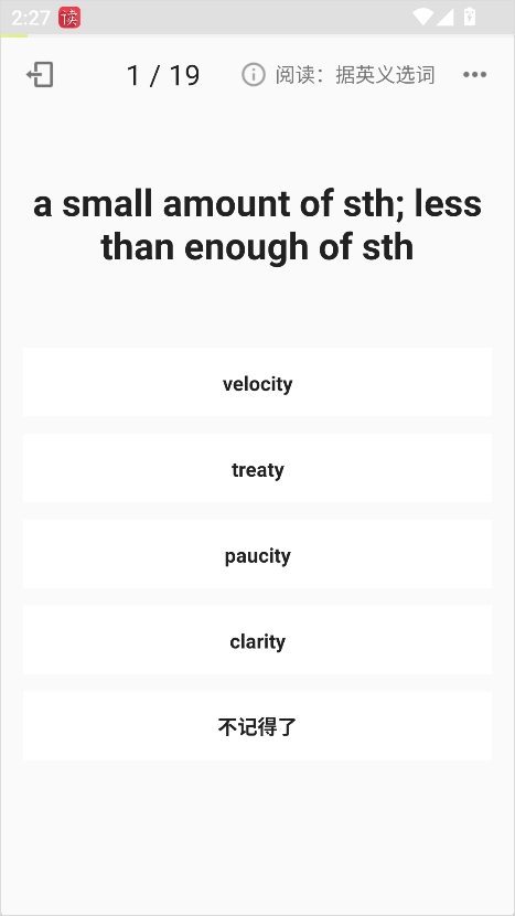 给出一个英文单词,从中挑选出它的正确释义或者近义词组。这种题型既能够检验对目标词本义的理解情况,又可以考察对选项里其他词汇的掌握程度,进而提升词汇辨析能力。