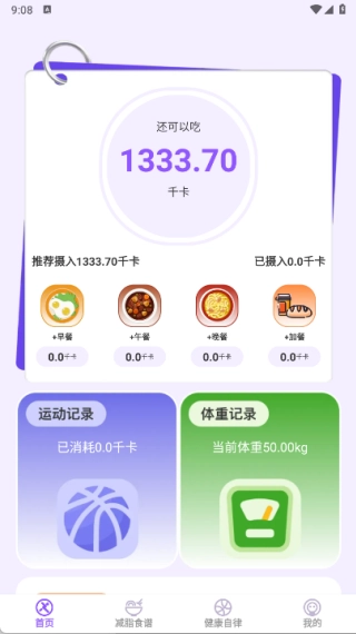 在首页能够查看可摄入的热量信息,此外还具备运动记录与体重记录这两项功能。