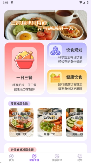 在减肥食谱页面,你能获取一日三餐安排、饮食规划建议、健康饮食知识,还能找到瘦身减脂食谱以及外卖食堂减脂食谱等实用内容。