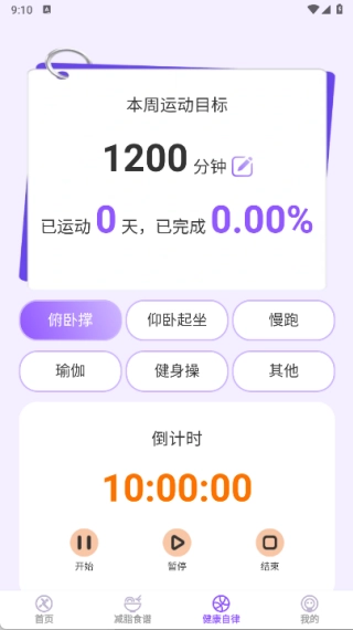 在健康自律页面里,你可以设定本周的运动目标,之后还能开展各类倒计时操作。