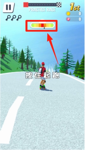 开始游戏时,请按住起跑键;有一点需要玩家留意:游戏开始后,主界面的光标位置对应着玩家的起跑速度,从两侧向中间过渡的颜色,其代表的速度是依次递增的。