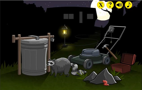 我们首先点击路灯的电线,接着点击除草机,让路灯的电线连接到除草机上;再点击除草机的开关,借此吓走浣熊。之后依次点击红色工具箱和锤子,用锤子敲击垃圾桶左上角的棍子,随后再点击一下那根木棍使其掉落,接着点击垃圾桶盖,再点击垃圾桶倒出来的垃圾。最后要先藏在垃圾中,再点击除草机的开关,等浣熊回来后点击浣熊(要是不先藏在垃圾里就关除草机,会出现好结局)。