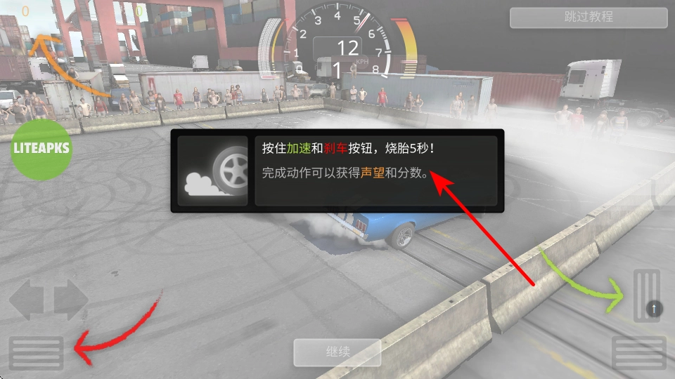 想要提升成就获取声望与分数奖励,就得按教程强化烧胎技巧——持续按住加速和刹车按钮完成5秒烧胎动作,务必保证动作执行到位。