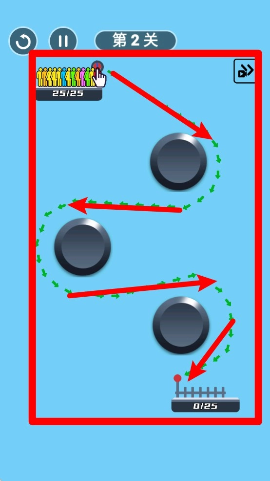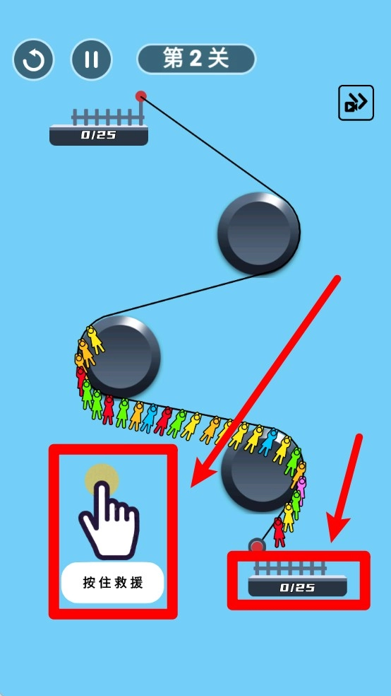 绘制路径指引:玩家需从人群起点拖动安全绳线,巧妙避开障碍,引导所有人安全抵达终点区域。