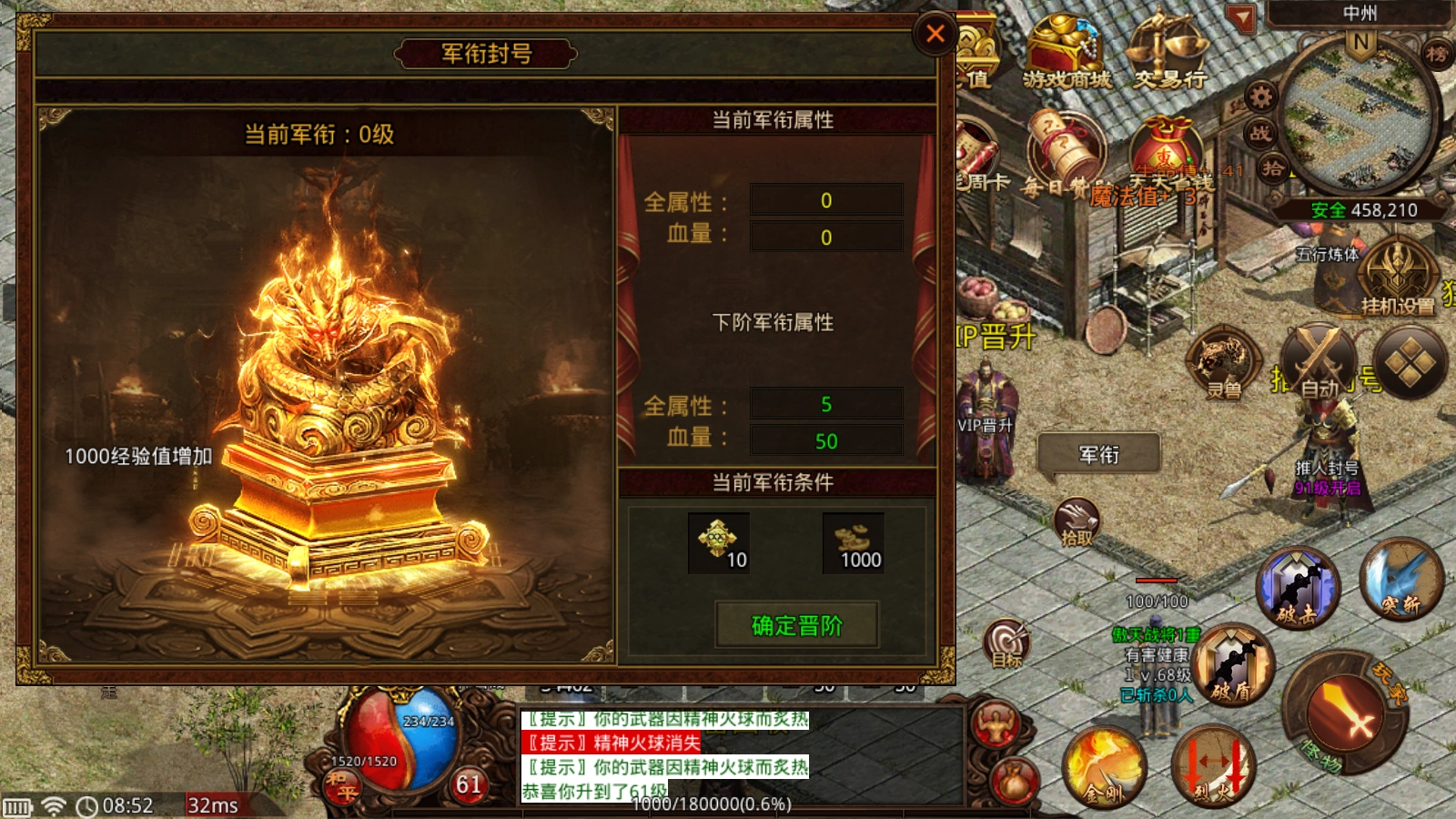 军衔提升:通过消耗军衔宝石与元宝就能完成升级,每升一级都能增加生命值和所有属性。