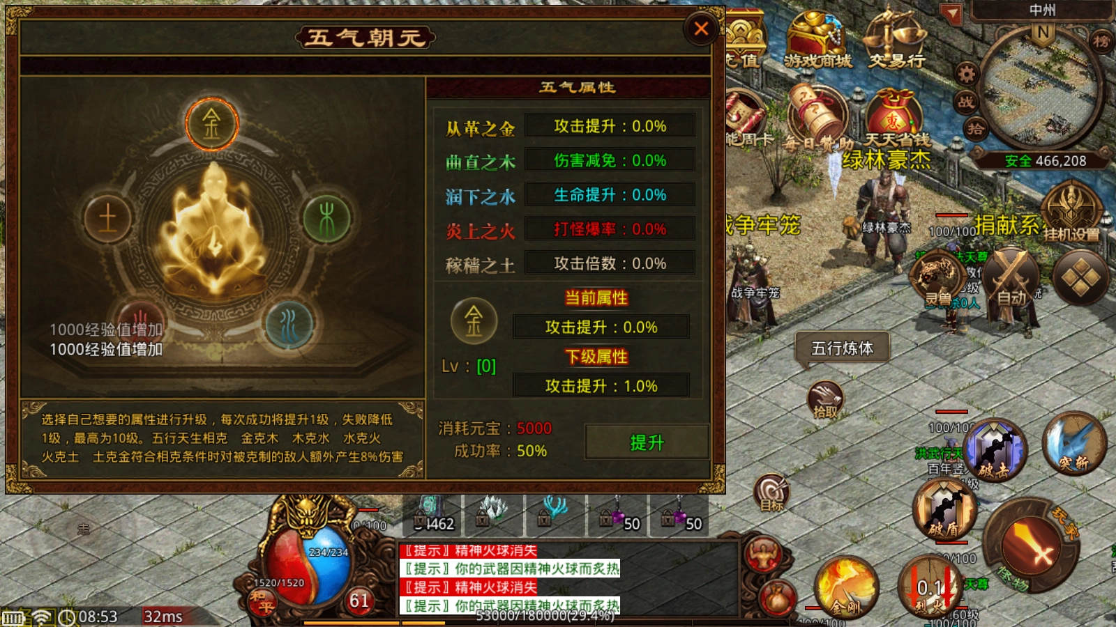 五行炼体:可挑选心仪的属性来升级,每次升级成功会提升1级,失败则降低1级,等级上限为10级。五行之间存在天生的相克关系,具体为金克制木、木克制水、水克制火、火克制土、土克制金,当满足相克条件时,对被克制的敌人能额外造成8%的伤害。