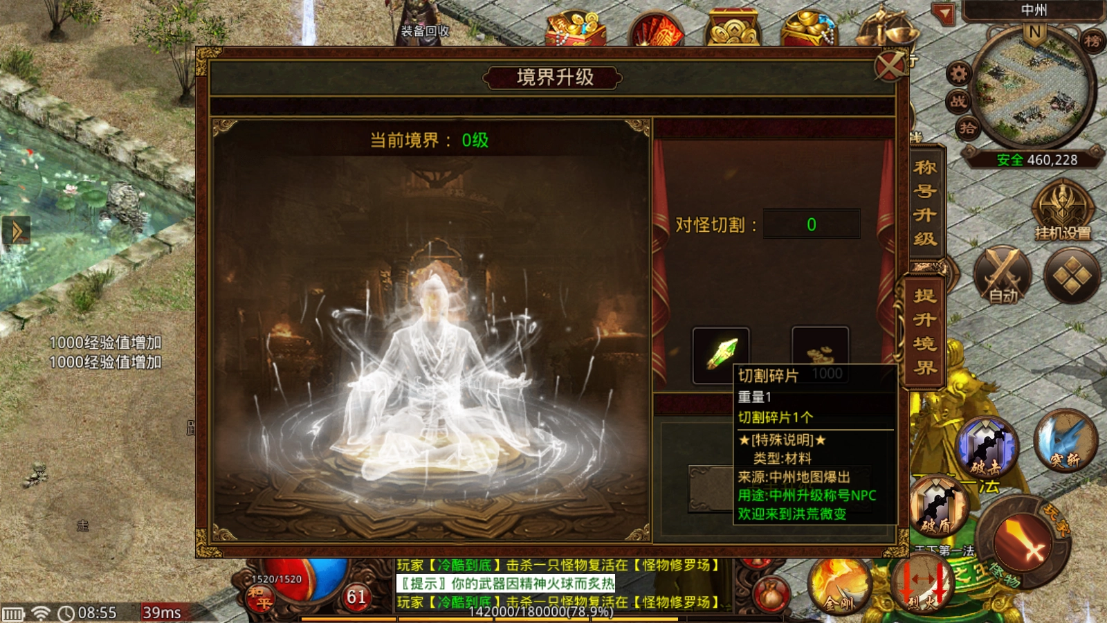 境界提升:消耗切割碎片与元宝可提升境界,从而增强对怪物的切割伤害。