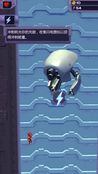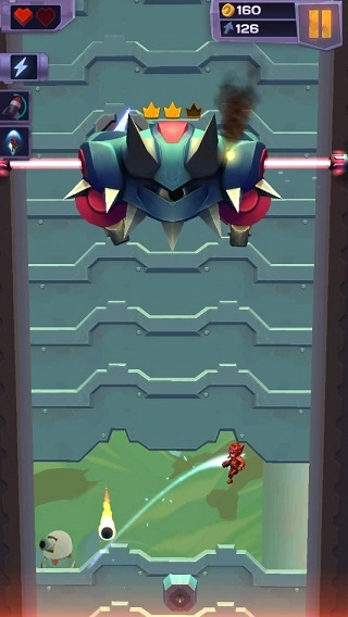 这是一款需要不断向上探索的游戏,自然存在能让主角死亡并结束游戏的元素。其中一个是从初始位置就开始向上移动的红外激光,另一个则是游戏里的人工智能。虽说这些人工智能外观不太好看,但正是它们在游戏设定的世界中对人类发起了攻击,迫使人类只能躲到地下生活。 主角具备两种战斗相关的能力:一种是经过一段时间就会自动发射的跟踪导弹,每枚导弹能消灭一个人工智能;另一种是在拥有能量时向上滑动屏幕,此时主角身体周围会生成一个护罩,进入无敌状态。 此外,游戏过程中会出现可供站立的跳台,主角落到跳台上后,会获得快速向上冲刺的效果,同时身上也会出现护罩,并且能持续一段时间。