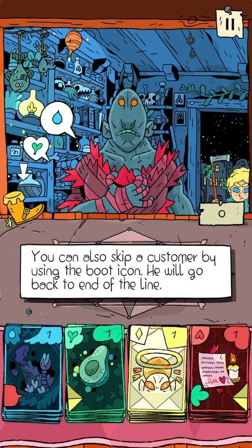 卡牌合成是这款游戏的核心玩法,玩家需要运用蓝色、绿色、黄色、红色这四种不同颜色的卡片进行组合,从而合成出各式各样的药水。每张卡片都对应着一种独特的材料或魔法元素,而玩家则要依据客户提出的需求,灵活且巧妙地挑选合适的卡牌来完成合成操作。