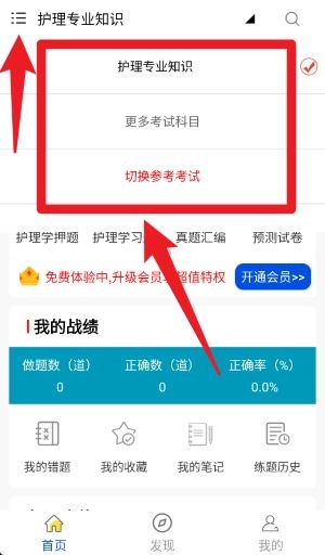 点击左上角的菜单图标,即可展开考试科目选择菜单,该菜单支持切换至其他专业考试,也可返回护理题库首页。