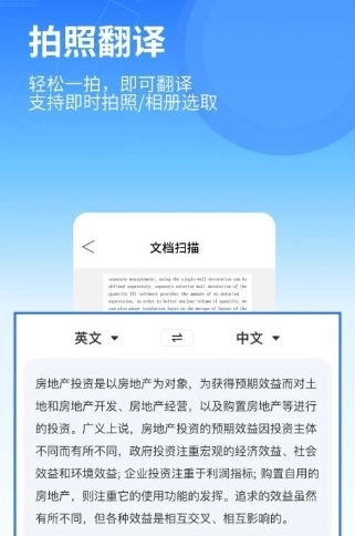 拍照扫描,即时翻译,支持多种语言的全文互译。