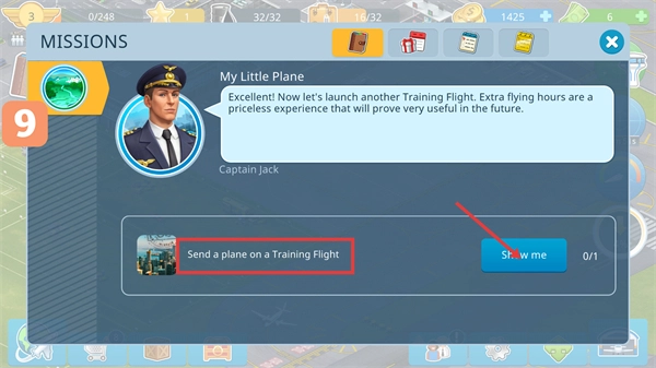 点击【Show-me】来执行【Send-a-plane-on-a-Training-Flight】任务,通过完成训练飞行来积累飞行经验。