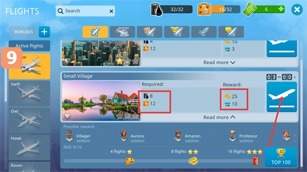 执行【Small-Village】航班,需消耗【8】份燃油与【12】名乘客,完成后可获得【25】金币等奖励,点击飞机图标即可开启飞行。