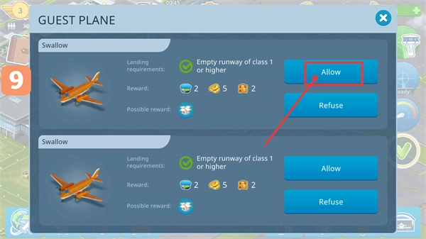 在【Guest-Plane】界面点击【Allow】按钮,对满足条件的飞机予以降落许可,以此获取金币、乘客数量等对应的奖励。