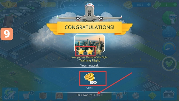 训练飞行结束后,会弹出【CONGRATULATIONS!】的提示,点击屏幕任意位置就能领取【100】金币奖励,助力推进游戏进度。