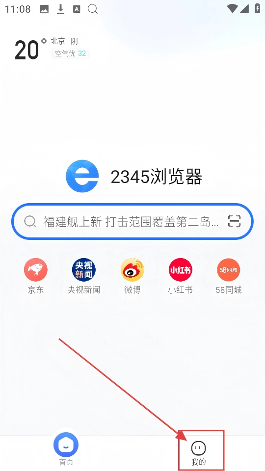 在2345浏览器的首页,点击右下角的【我的】按钮,就可以进入个人相关页面,从而开启后续的操作啦。