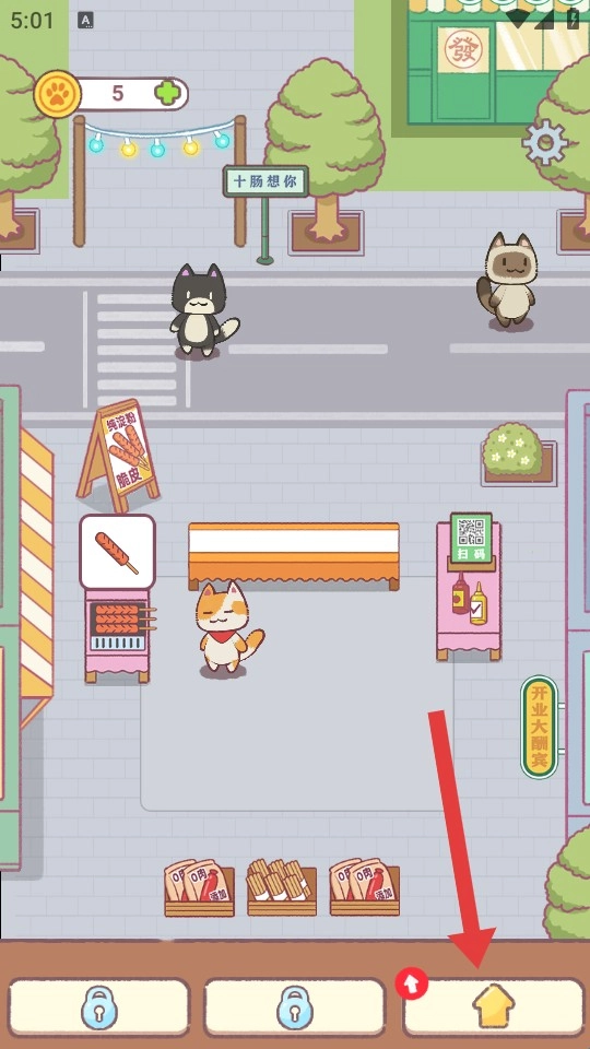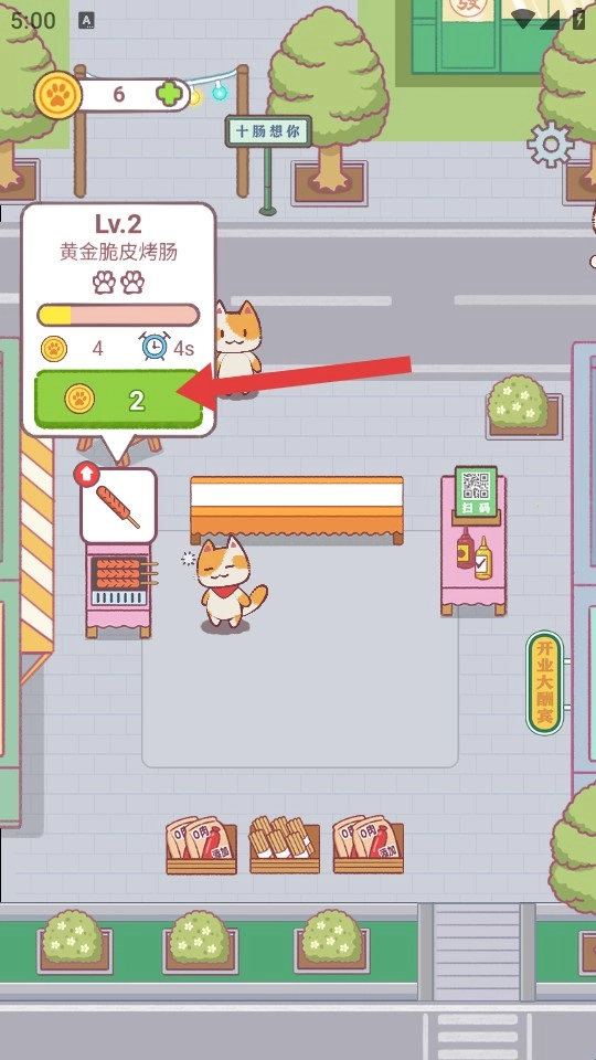 进入游戏界面后,首先注意红框里显示的金币数目是【6】,接着点击红箭头指向的【烤肠摊位】。