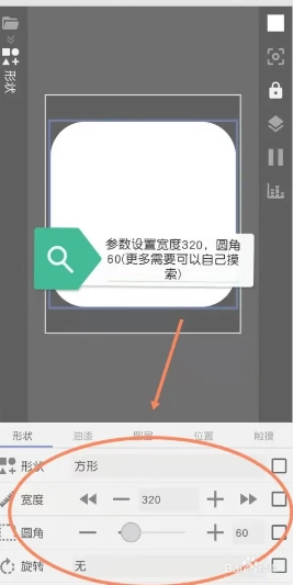 建议把宽度设置为320,圆角值调整为60(具体的数值可以依据个人的审美喜好来灵活变动)。