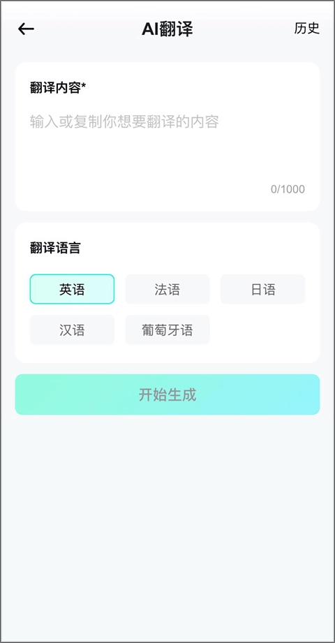 输入需要处理的内容,选定目标语言,再点击“开始生成”按钮。