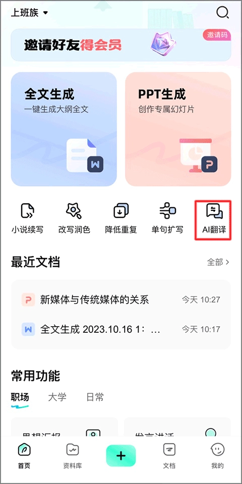 在首页点击“PPT生成”选项,就能快速进入模板页面开始制作。