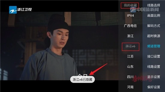 找到你需要隐藏的频道名称,例如我打算隐藏“收藏”和“浙江v6”这两个栏目,点击之后就会显示已隐藏的提示。