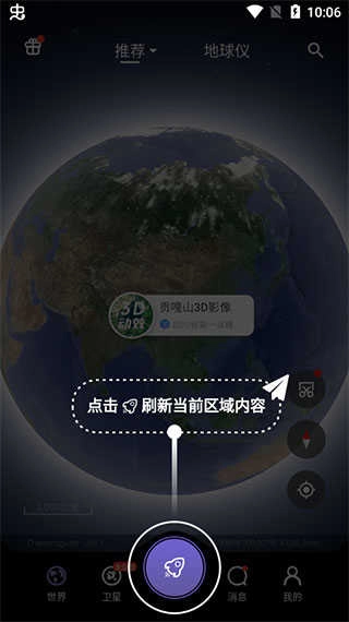 完成共生地球App的安装后打开它,进入主界面。点击屏幕中央的小飞机图标,就能快速刷新当前视图内容,这种方式尤其适合图像模糊或者加载不完整的情况。