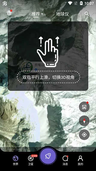 在支持3D地形的区域,用双指平行向上滑动,就能一键切换到逼真的三维地球视角,体验身临其境的地貌起伏和建筑立体感。