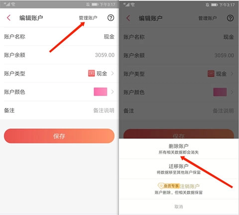 进入账号编辑界面,点击“管理账户”选项,接着选择“删除账户”。