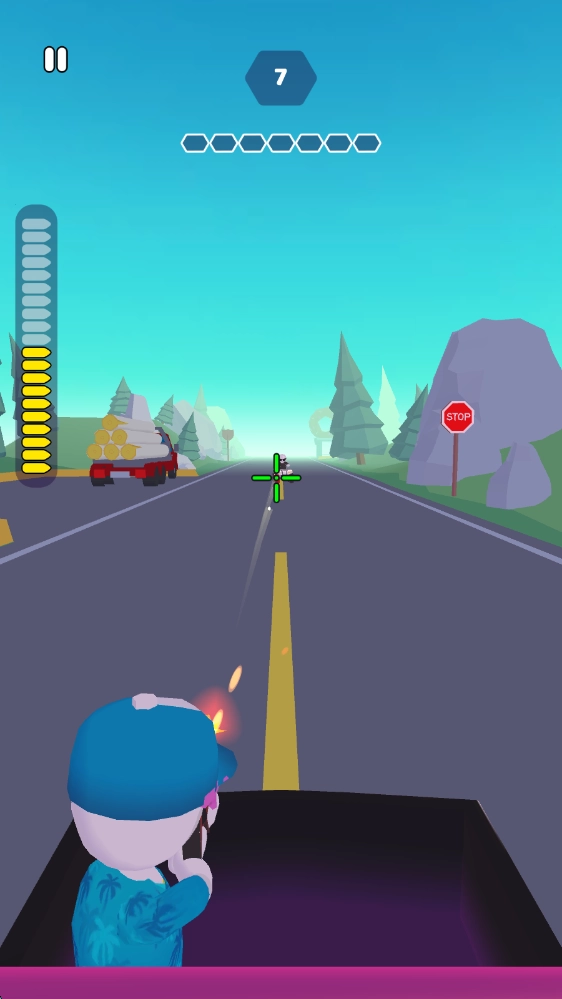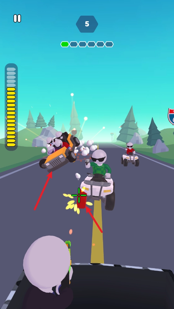 关卡开启后,我们会藏在车里,等敌人一出现,准心就会自动对准敌人汽车的轮胎。
