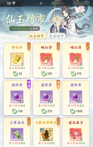 每日快速收益要全部购买;(2)只承接紫色及以上品质的游历任务,若未出现紫色任务就使用仙玉进行刷新;(3)野外副本的扫荡次数务必购买;(4)VIP礼包中所有限购的礼包都要购买;(5)灵石探采必须参与购买,争取冲击灵石探采排行榜获取奖励;(6)仙玉坊市中的寻仙令、唤仙符、道法真言、进阶丹是必买品;灵石坊市的物品则根据自身情况酌情选购;(7)游戏会上线道途历练活动,届时可以购买各类仙玉礼包