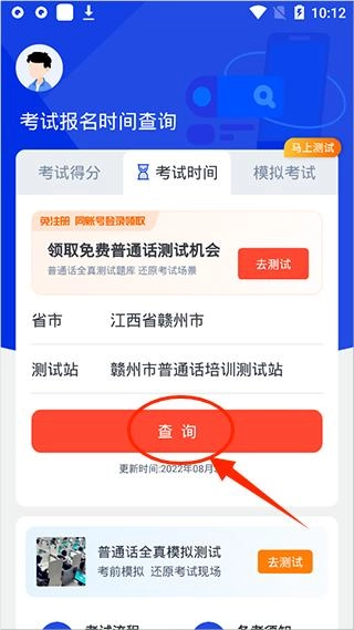 确认无误后点击“查询”,即可获取本测试站的考试时间通知。