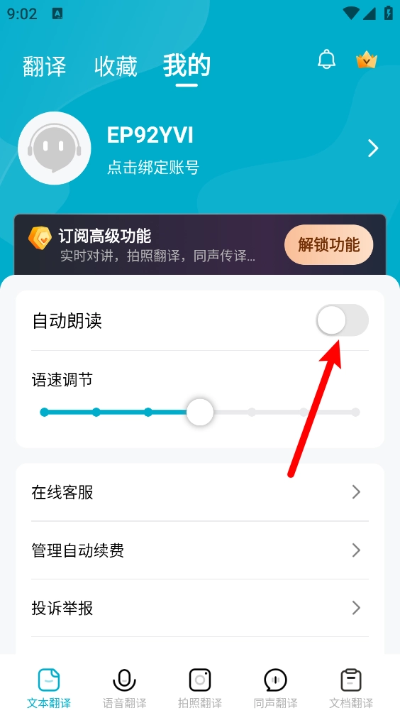 最后在我的页面,你可以开启自动朗读功能的开关,翻译完成后系统就会自动进行朗读。