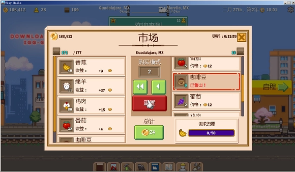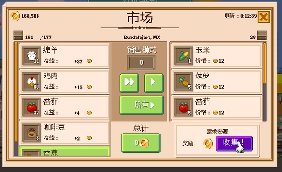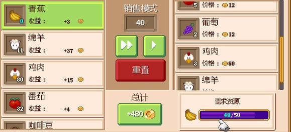 每个地区都设有物品收集任务,提交指定物品就能获取奖励……(这任务完全是赔本买卖,所以能完成就行)比如交25个给1000奖励,50个给2000,150个才给300……1000个居然只给5000(什么鬼,这批发商也太黑了)。由于要推进地区开发,收集任务是必须做的,所以我摸索出了下面这个操作:看到该地区在收香蕉,我先卖了40多个,接着点进其他交易品的界面,调整好数量后,直接点了重置!!!这里必须强调——重置、重置、重置……(重要的事说三遍)。做完这一步,就能看到刚才卖掉的香蕉重新出现在市场里了。