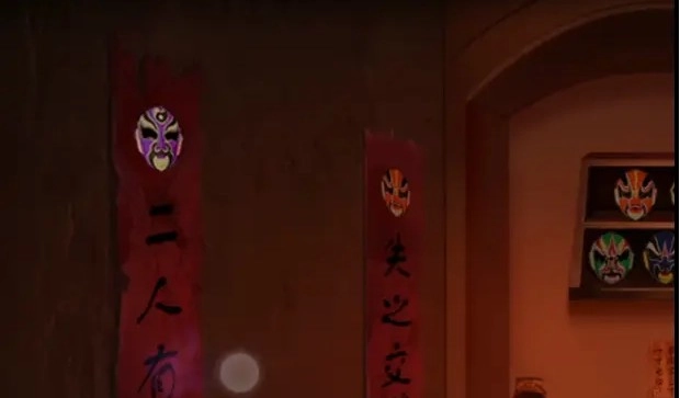 剧情结束后,先捡起桌子左下角那个刻着“齐”字的圆木块。右边的纸人处会有高能场景,高能过后会得到一个刻着“天”字的圆木块——这难道是“寿与天齐”的暗示?把视角稍微往左拖动,能看到两幅对联:紫色那副“二人有心在一起”,“二人”组合起来正是“天”字;红色那副“失之交臂川中行”,“交”字去掉中间的“乂”(像失去胳膊)变成“文”,再放在“川”字中间、去掉“川”的竖画并架在上方,就组成了“齐”字。将这两个圆木块对应安装好,就能获得一根红色吊索。